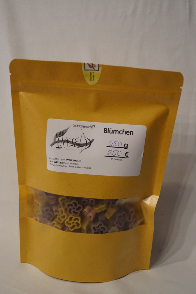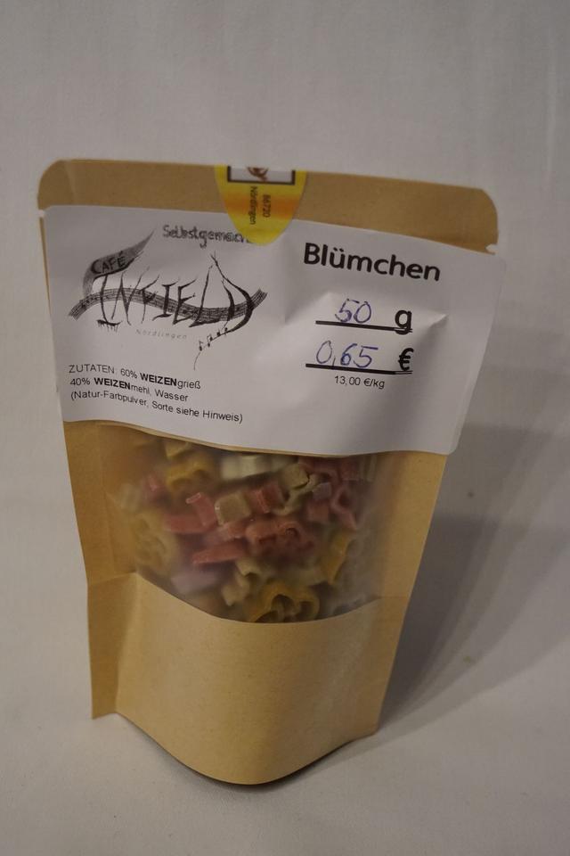 Zutaten: 60% WEIZENgrieß, 40% WEIZENmehl, Wasser, Natur-Farbpulver (je nach Variante: Weizengras, Kurkuma, Spirulina, Rote Beete, Purpur-Süßkartoffel)