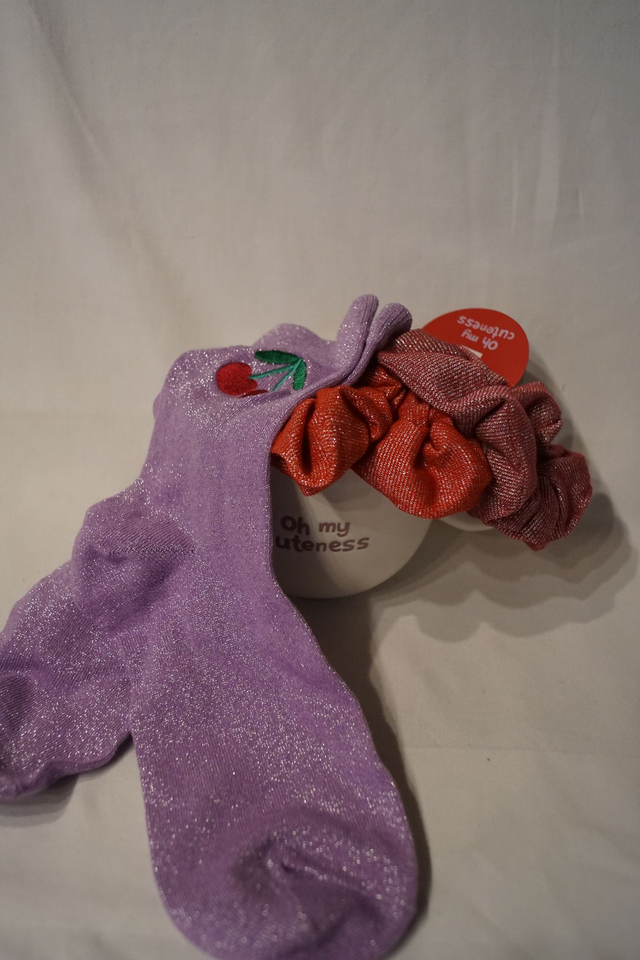 Das Set besteht aus Tasse, 2x Haargummi und einem Paar Socken.