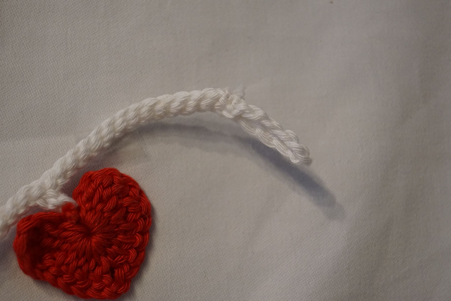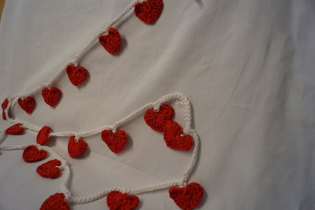Gehäkelte Girlande mit roten Herzen. Größe der Herzen ca. 4x2,5 cm.