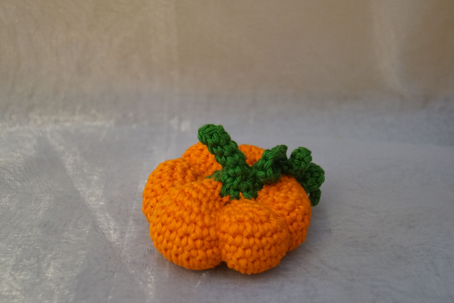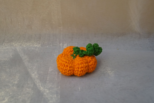 Der Kürbis ist aus Baumwolle gehäkelt, und steht stabil.