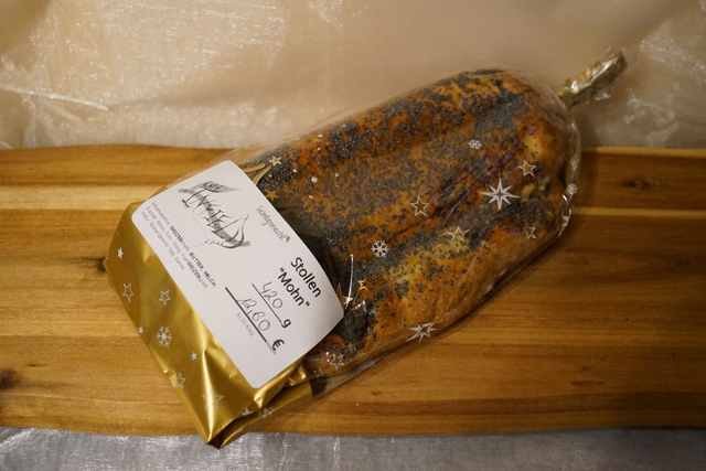 Zutaten: WEIZENMEHL, BUTTER, MILCH, Zucker, Mohn, Eier, Honig, HARTWEIZENGRIEß, Hefe, Stollengewürz, Salz, Vanille.