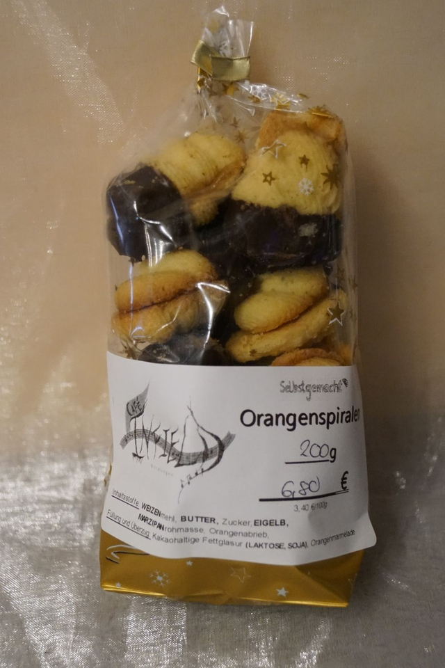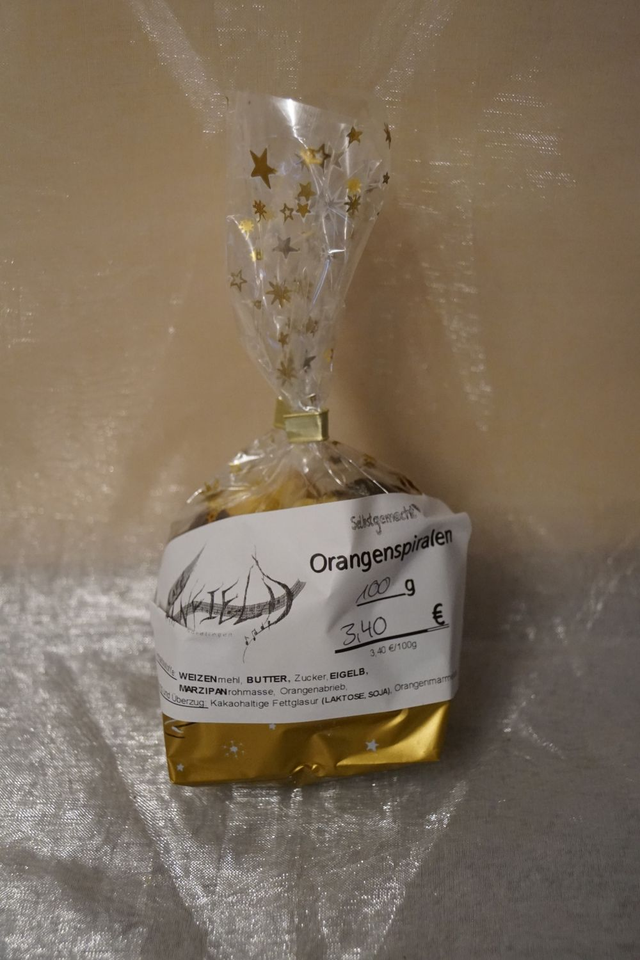 Zutaten: WEIZENMEHL, BUTTER, Zucker, EIGELB, MARZIPANROHMASSE, Orangenabrieb, Überzug: kakaohaltige Fettglasur (enthält LAKTOSE, SOJA), Füllung: Orangenmarmelade