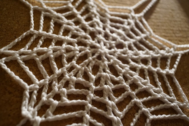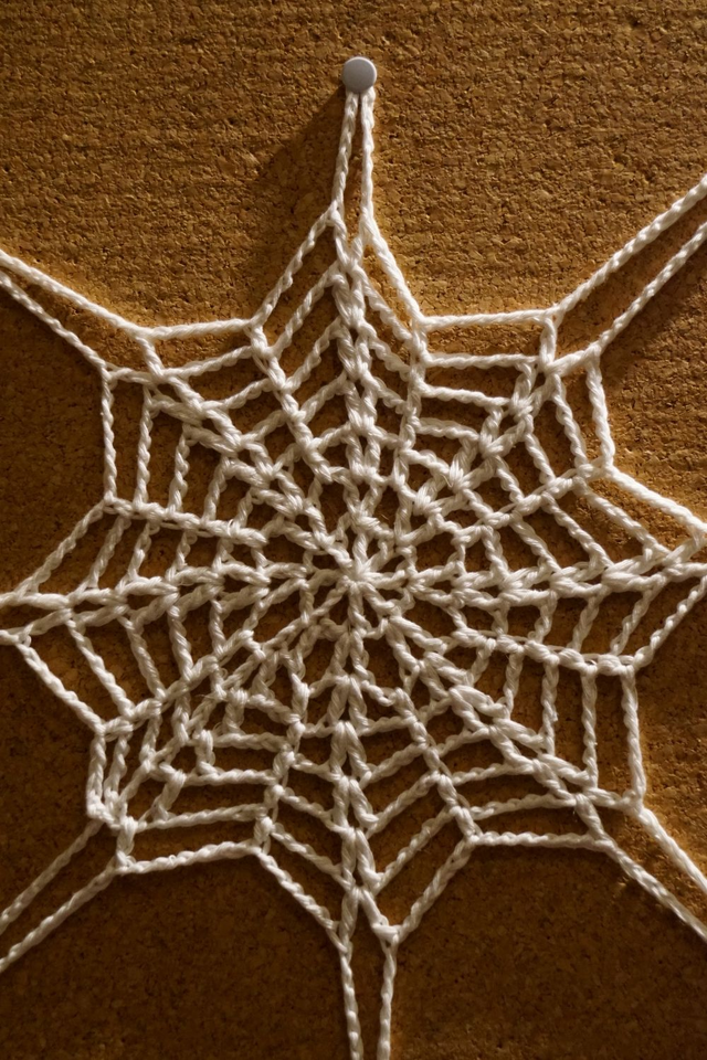 Gehäkeltes Spinnennetz aus weißem Garn.
