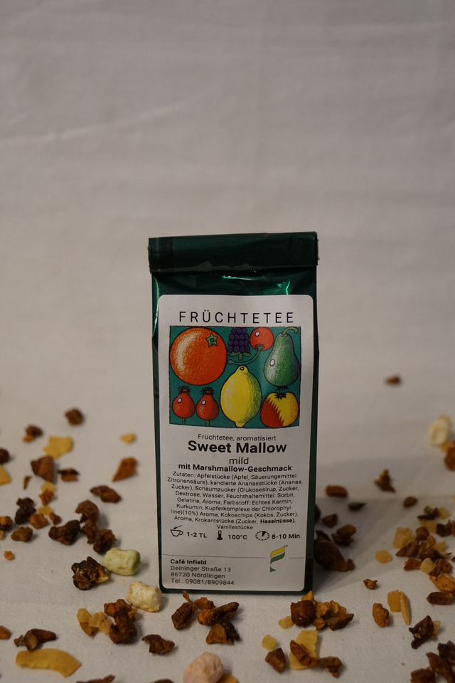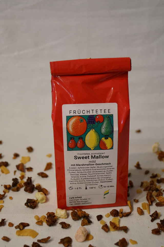 Zutaten: Apfelstücke (Apfel, Säuerungsmittel: Zitronensäure), kandierte Ananasstücke (Ananas, Zucker), Schaumzucker (Glukosesirup, Zucker, Dextrose, Wasser, Feuchthaltemittel: Sorbit, Gelatine, Aroma, Farbstoff: Echtes Karmin, Kurkumin, Kupferkomplexe der Chlorophylline) (10%), Aroma, Kokoschips (Kokos, Zucker), Aroma, Krokantstücke (Zucker, HASELNÜSSE), Vanillestücke