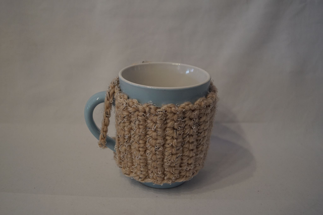 Auf den Bildern sind Farbe und Wollstärke (Grob oder fein) erkennbar. Der Pullover hat rechts und links Schlaufen, die man über den Tassenhenkel ziehen kann, damit der Pulli fest sitzt.