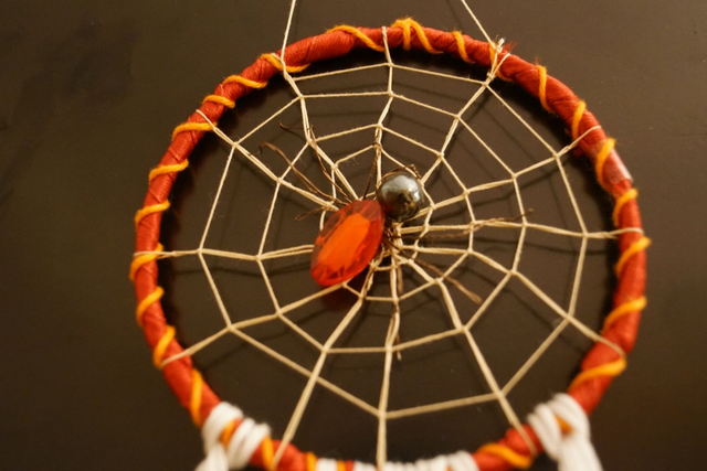 Statt der klassischen Traumfänger-Knüpfung wurde bei diesem Stück das Garn nach dem Design eines Spinnennetzes geknüpft. In der Mitte sitzt eine Spinne aus Perlen und Draht.