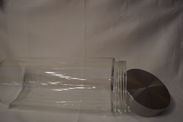 Das Glas hat einen Schraubdeckel aus Metall.